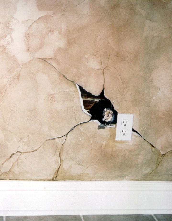 Trompe L' oeil of a tiny mouse peering through a hole in the wall